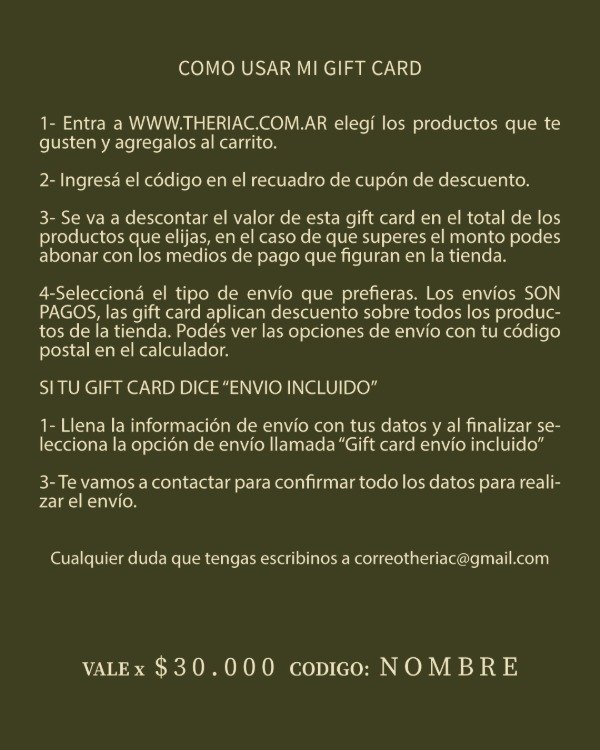 Junto a la tarjeta de regalo se envía instrucciones de uso para quien la recibe sepa cómo agregar los productos, código de descuento y explicación de envíos.